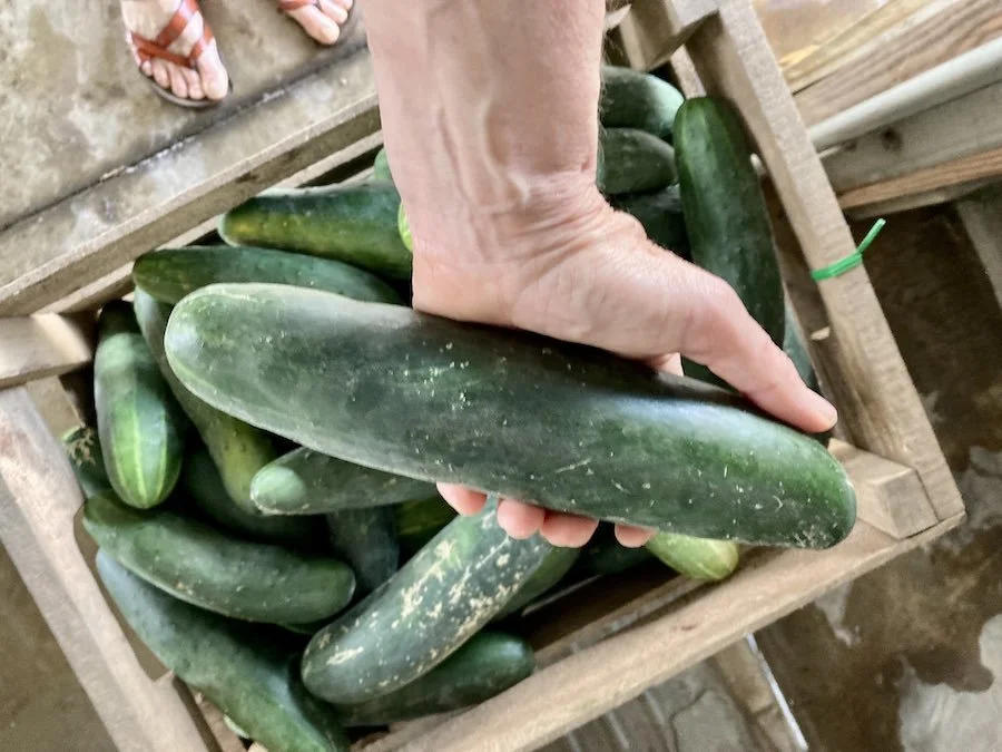 CUCUMBERS - both the “regular” American slicers, and the Indian Poona Keera. Don’t let the bronze skin of the Poona Keera fool you — they are not over-mature, but perfectly ripe, juicy, and delicious!