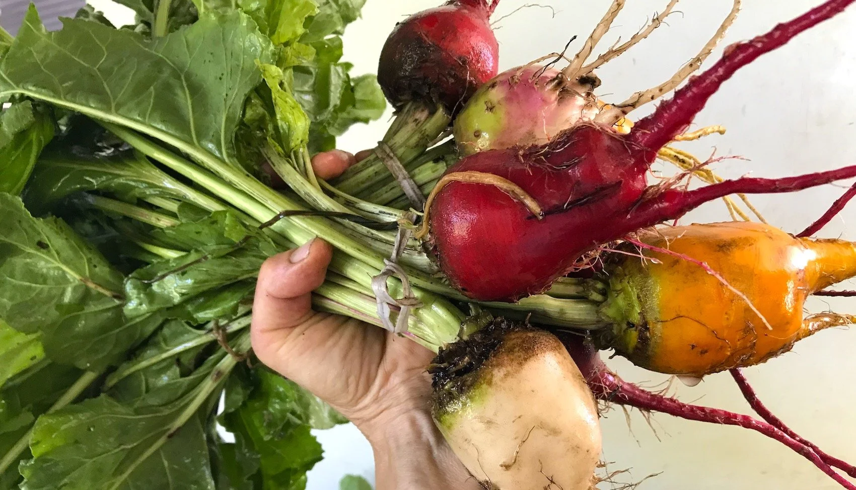 Henry harvested his first fall planting of Rainbow Beets, and they have really nice tops. It’s basically a 2-fer deal because you get a big beautiful bunch of beet greens for free with every bunch of beets you buy!